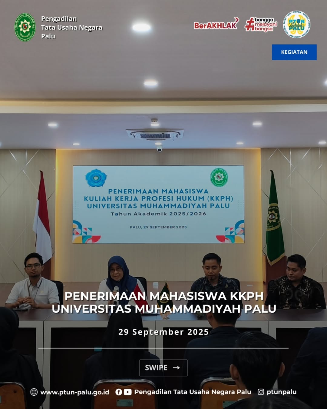 Penerimaan Mahasiswa KKPH Universitas Muhammadiyah Palu Ketua Pengadilan Tata Usaha Negara Palu, Rosidah, S.H. menyambut kedatangan Mahasiswa Fakultas Hukum Universitas Muhammadiyah Palu yang akan melaksanakan Kuliah Kerja Profesi Hukum (KKPH) Tahun akademik 2025/2026. Penyambutan Mahasiswa KKPH didampingi oleh Alif Wili Utama, S.H., M.H selaku Hakim PTUN Palu Sekaligus Mitra Pembimbing Lapangan (MPL).Hadir Pula Wakil Dekan …