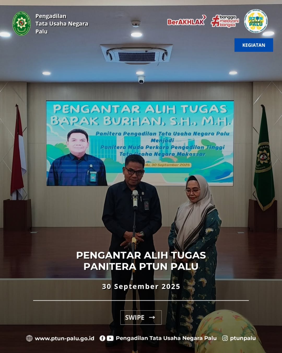 Pengantar Alih Tugas Panitera PTUN Palu Bertempat di Ruang Serbaguna PTUN Palu, telah dilaksanakan kegiatan pengantar alih tugas Bapak Burhan, S.H., M.H. selaku Panitera PTUN Palu yang akan menjadi Panitera Muda Perkara PTTUN Makassar. Kegiatan ini dihadiri oleh Ketua, Wakil Ketua, Para Hakim, Pejabat Struktural, Pejabat Fungsional, Staff, PPPK, CPNS, serta Mahasiswa PKL. Kami segenap …