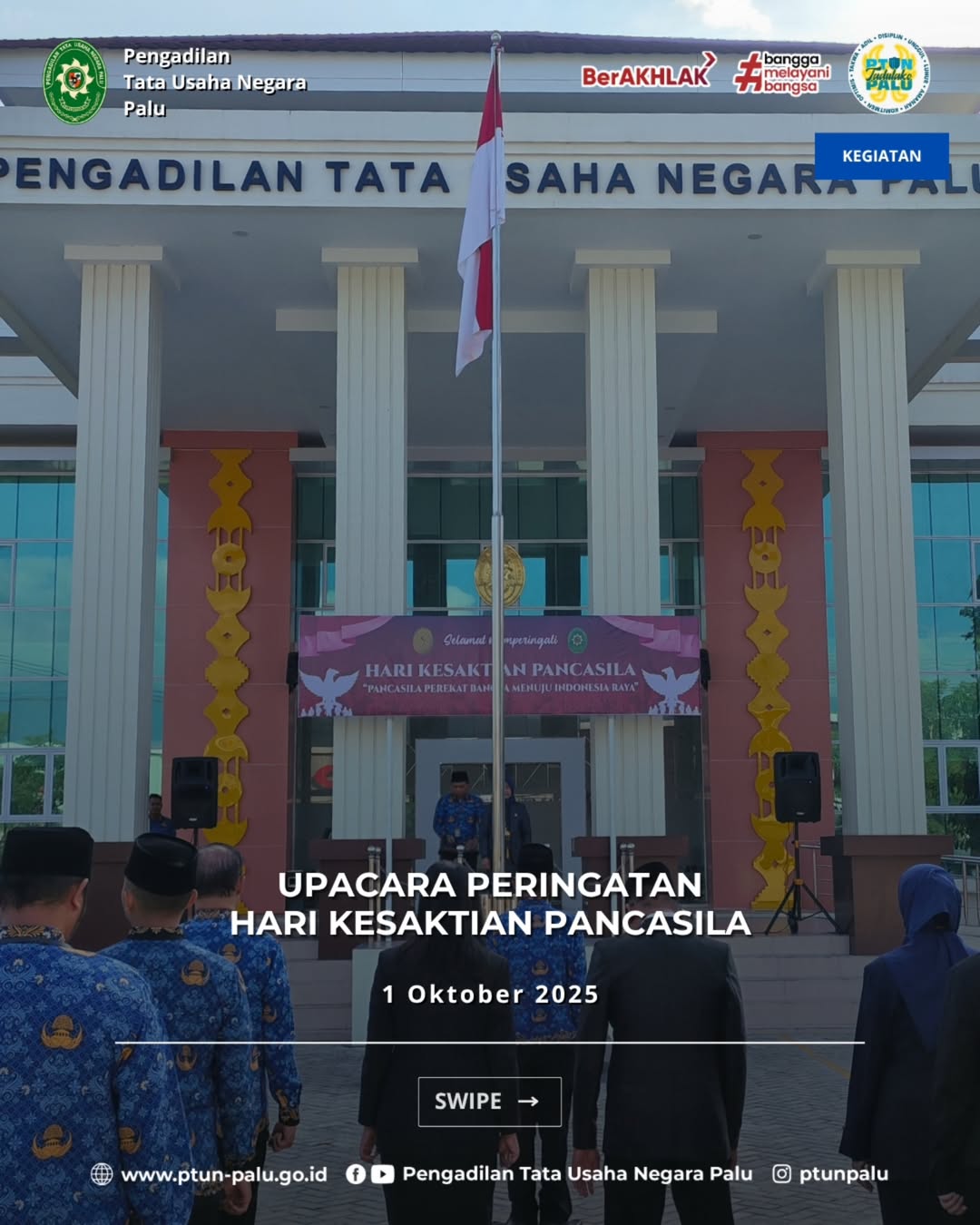 Upacara Peringatan Hari Kesaktian Pancasila Berdasarkan Surat Nomor: 516 /KPTUN.W4-TUN2/HM3.1/IX/2025 tanggal 30 September 2025, dalam rangka peringatan Hari Kesaktian Pancasila dengan tema “Pancasila Perekat Bangsa Menuju Indonesia Raya”, Pengadilan Tata Usaha Negara Palu melaksanakan Upacara Peringatan Hari Kesaktian Pancasila dengan hikmat yang dipimpin oleh Ketua Pengadilan Tata Usaha Negara Palu dan diikuti oleh seluruh Aparatur …