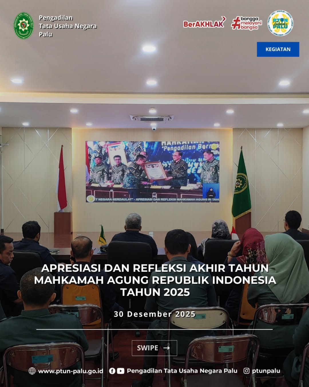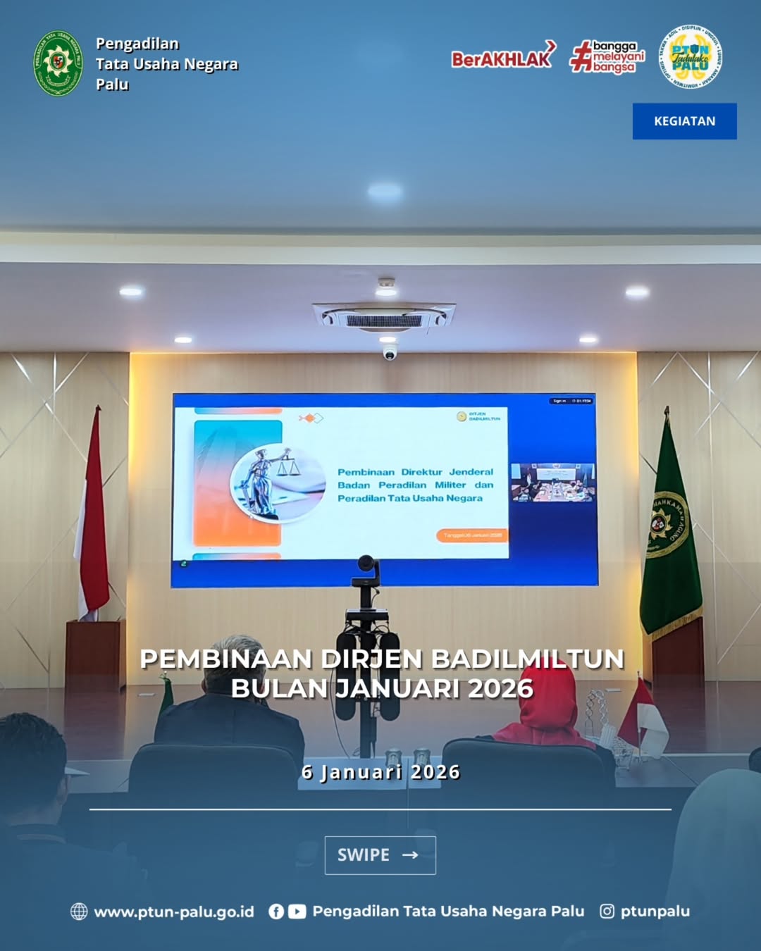Pembinaan DIRJEN BADILMILTUN Bulan Januari 2026 Ketua, Wakil Ketua, dan para Hakim, Pejabat Struktural dan Pejabat Non-Struktural, serta Aparatur Sipil Negara pada Pengadilan Tata Usaha Negara Palu menghadiri kegiatan Pembinaan Direktur Jenderal Badan Peradilan Militer Dan Peradilan Tata Usaha Negara Mahkamah Agung Republik Indonesia berdasarkan Surat Direktur Jenderal Badan Peradilan Militer dan Peradilan Tata Usaha …