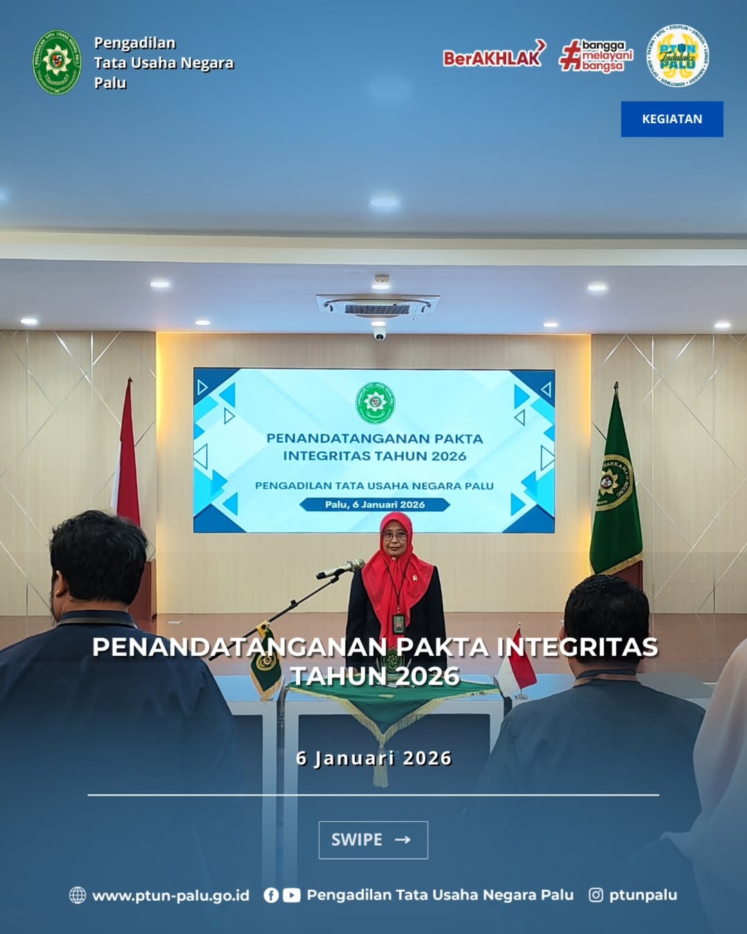 Penandatanganan Pakta Intergitas Tahun 2026 Pengadilan Tata Usaha Negara Palu menyelenggarakan kegiatan Penandatanganan Pakta Intergitas bagi Aparatur Pengadilan Tata Usaha Negara Palu berdasarkan Surat Ketua Pengadilan Tata Usaha Negara Palu Nomor 50/KPTUN.W4-TUN2/UND.OT1/I/2026 tanggal 5 Januari 2026 hal: Undangan Penandatanganan Pakta Integritas 2026, yang diselenggarakan di Ruang Serba Guna Pengadilan Tata Usaha Negara Palu. Kegiatan Penandatanganan …