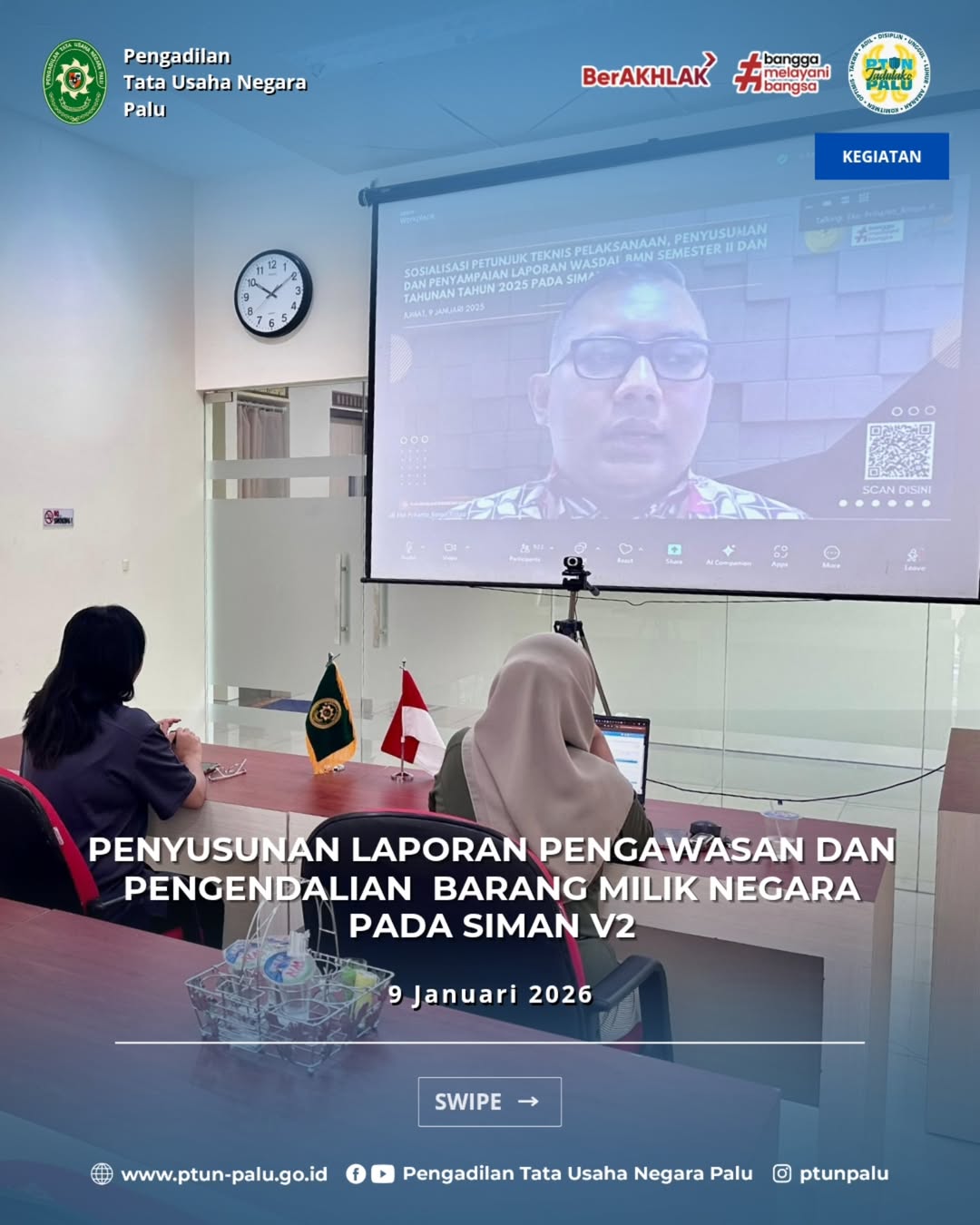Penyusunan dan Penyampaian Laporan Pengawasan dan Pengendalian BMN Sehubungan dengan Surat Sekretaris Mahkamah Agung Republik Indonesia Nomor 22/SEK/PL1.2.7/I/2026 Hal Pelaksanaan, Penyusunan, dan Penyampaian Laporan Pengawasan dan Pengendalian Barang Milik Negara Semester II dan Tahunan Tahun 2025 tanggal 8 Januari 2026, maka perlu diadakan Sosialisasi Petunjuk Teknis Pelaksanaan, Penyusunan dan Penyampaian Laporan Pengawasan dan Pengendalian BMN …