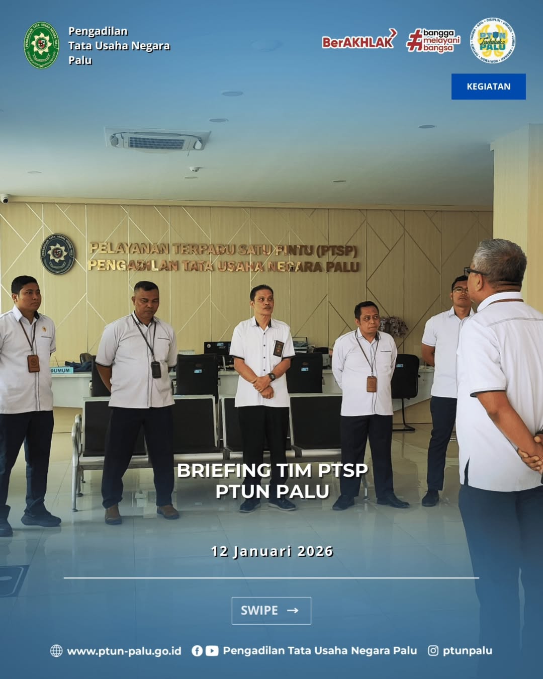 Briefing TIM PTSP PTUN Palu Sebelum memulai pelayanan, Tim Pelayanan Terpadu Satu Pintu (PTSP) PTUN Palu melaksanakan briefing pagi yang dipimpin oleh Wakil Ketua PTUN Palu Bapak Dedy Kurniawan, S.H. Kegiatan ini bertujuan untuk menyelaraskan komitmen, mengevaluasi kendala, dan memastikan seluruh petugas siap memberikan layanan yang Prima, Transparan, dan Akuntabel kepada masyarakat pencari keadilan.