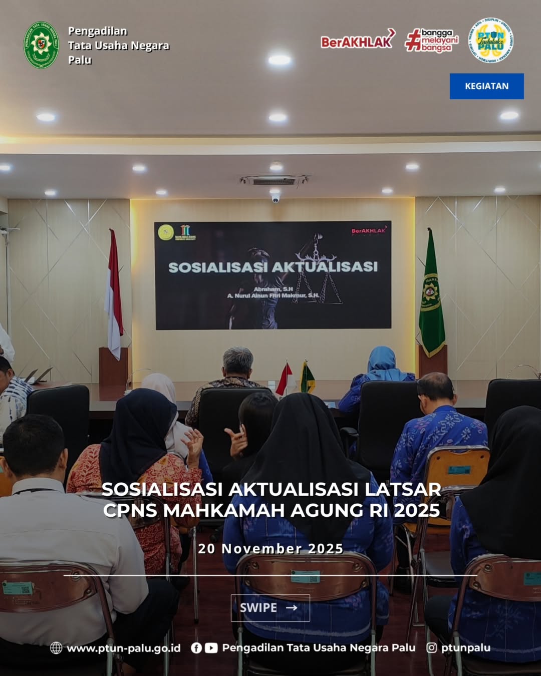 Sosialisasi Aktualisasi Latsar CPNS Mahkamah Agung RI 2025 Sosialisasi Aktualisasi Latsar CPNS Mahkamah Agung 2025. Sebuah proses awal untuk memperkuat karakter, kompetensi, dan integritas para calon aparatur. Menuju peradilan yang semakin transparan, profesional, dan berorientasi pelayanan.