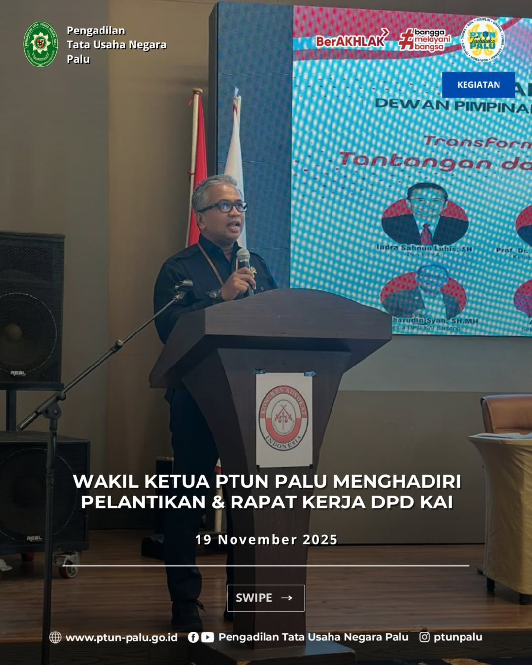 Wakil Ketua PTUN Palu Menghadiri Pelantikan & Rapat Kerja DPD KAI Wakil Ketua Pengadilan Tata Usaha Negara Palu menghadiri Pelantikan dan Rapat Kerja Dewan Pimpinan Daerah Kongres Advokat Indonesia (DPD KAI) Provinsi Sulawesi Tengah Periode 2025-2030. Kegiatan tersebut merupakan agenda rutin yang diselenggarakan oleh DPD KAI Sulawesi Tengah Periode 2025-2030 dengan mengusung tema, “Transformasi Peran …