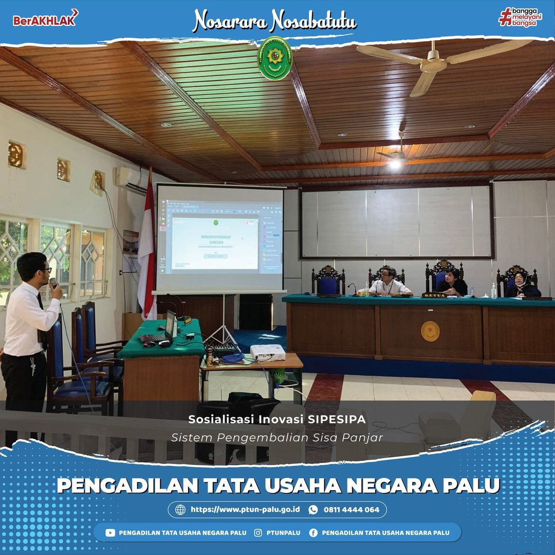 Sosialisasi Invoasi SIPESIPA (Sistem Pengembalia Sisa Panjar) Palu, 31 Mei 2022 Pelaksanaan Sosialisasi dan Pengenalan Inovasi SIPESIPA (Sistem Pengembalian Sisa Panjar) PTUN Palu yang merupakan aktualisasi Latsar CPNS Mahkamah Agung RI Tahun 2022 oleh Ade Ariyo Yudanto, A.Md.Kom. Bertempat di ruang Sidang Utama Pengadilan Tata Usaha Negara Palu, sosialisasi ini diikuti oleh Ketua, Wakil Ketua, …
