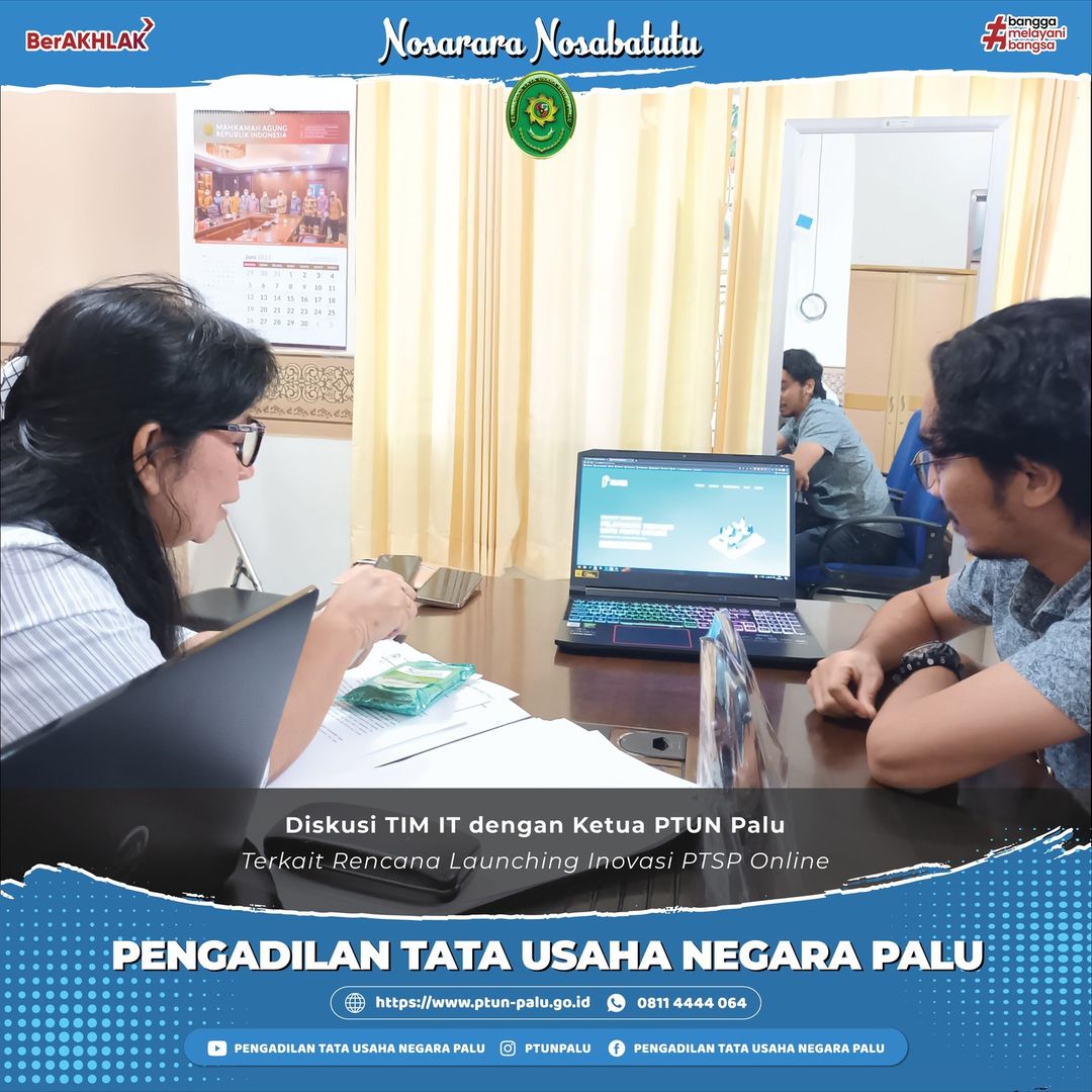 Diskusi TIM IT dengan Ketua PTUN Palu terkait Rencana Launching Inovasi PTSP Online Palu, 3 Juni 2022 TIM IT PTUN Palu melakukan diskusi dan pemaparan dengan Ketua PTUN Palu terkait dengan inovasi terbaru PTUN Paluyaitu PTSP Online. Perwakilan TIM IT, Aditya Reza Gusnanda, A.Md.Kom., melakukan pemaparan singkat tentang fitur-fitur dan kemudahan yang disediakan PTSP Online …