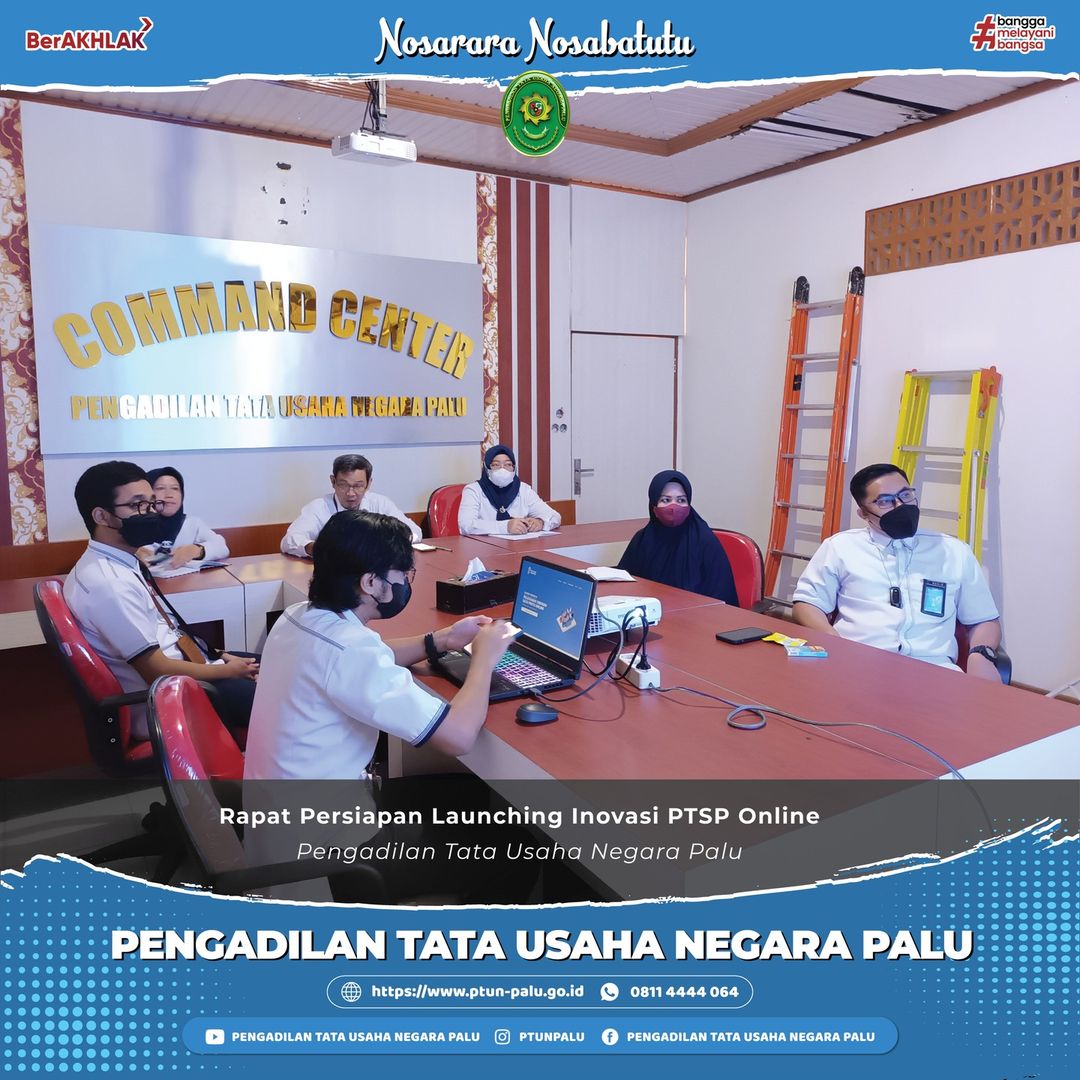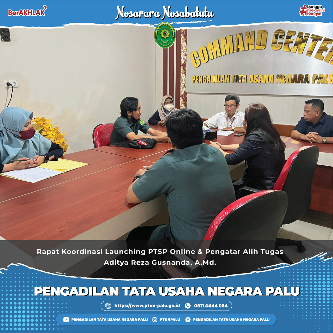 Rapat Koordinasi Launching PTSP Online & Pengantar Alih Tugas Aditya Reza Gusnanda, A.Md. Palu, 8 Juni 2022 Wakil Ketua PTUN Palu bersama dengan Plh. Sekretaris, Kasubbag Kepegawaian & Ortala, Kasubbag Umum & Keuangan, Panitera Muda Perkara dan TIM IT PTUN Palu melakukan diskusi dan koordinasi terkait teknis pelaksanaan launching inovasi terbaru PTUN Palu yaitu PTSP …