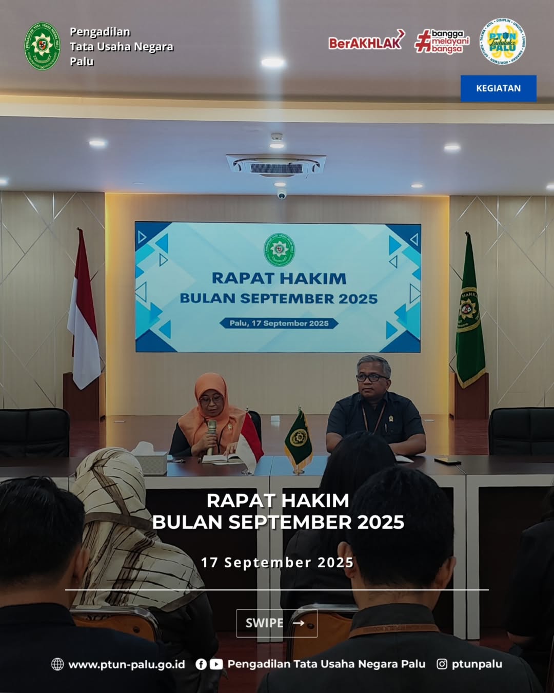 Rapat Hakim Bulan September 2025 Rapat Hakim yang dipimpin oleh Ketua & didampingi Wakil Ketua PTUN Palu, di hadiri seluruh Hakim pada PTUN Palu.