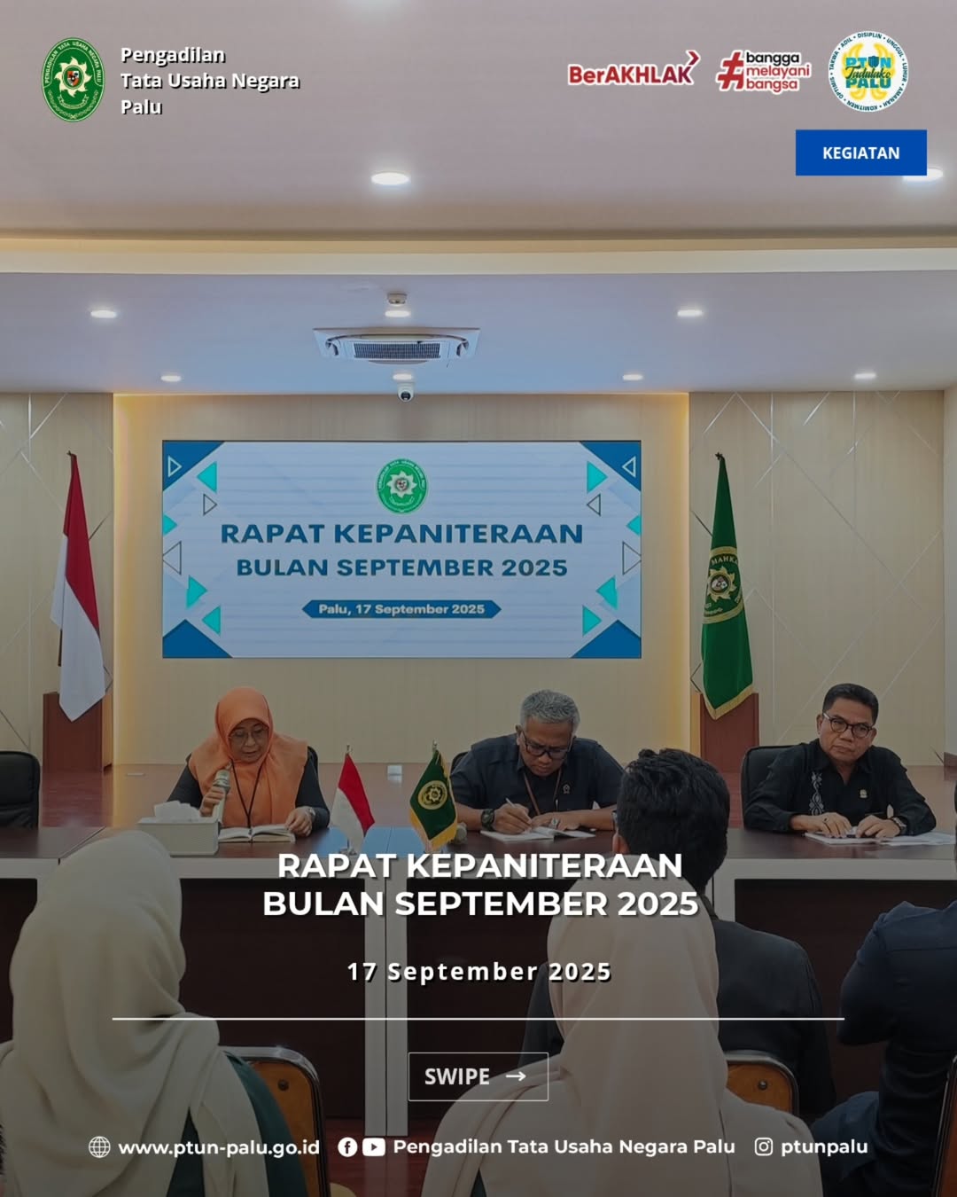 Rapat Kepaniteraan Bulan September 2025 Rapat bagian Kepaniteraan yang dipimpin oleh Ketua PTUN Palu ibu Rosidah, S.H. didampingi Wakil Ketua bapak Dedy Kurniawan, S.H. & Panitera PTUN Palu bapak Burhan, S.H., M.H. yang dihadiri Panmud Perkara, Panmud Hukum, Panitera Pengganti, Jurusita Pengganti, serta pegawai & staf yang ada pada bagian Kepaniteraan PTUN Palu.