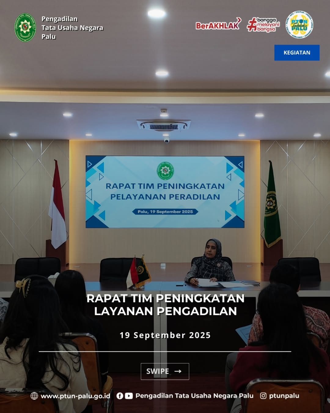 Rapat Kesekretariatan Bulan September 2025 Rapat bagian Kesekretariatan yang dipimpin oleh Ketua PTUN Palu ibu Rosidah, S.H. didampingi Wakil Ketua bapak Dedy Kurniawan, S.H. dan Sekretaris ibu Imelda Christine, S.E. yang dihadiri Hakim Pengawas Bidang, Kepala Sub Bagian, serta jajaran Pegawai & Staf yang ada pada bagian Kesekretariatan PTUN Palu.
