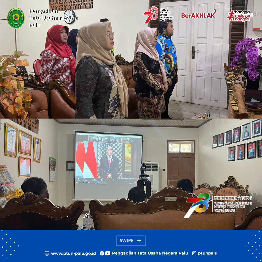 Pengadilan Tata Usaha Negara Palu (PTUN Palu) menghadiri undangan rangkaian acara dalam rangka memperingati HUT Mahkamah Agung RI Ke-78 yang diselenggarakan oleh Mahkamah Agung RI secara daring melalui aplikasi Zoom dan Kanal Youtube resmi Mahkamah Agung pada hari Jum’at, 18 Agustus 2023 pukul 14.30 WITA.