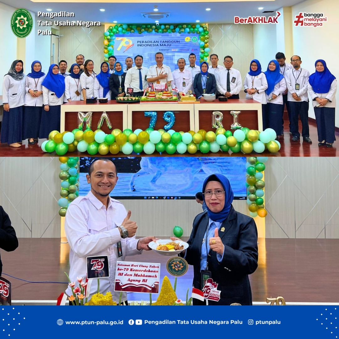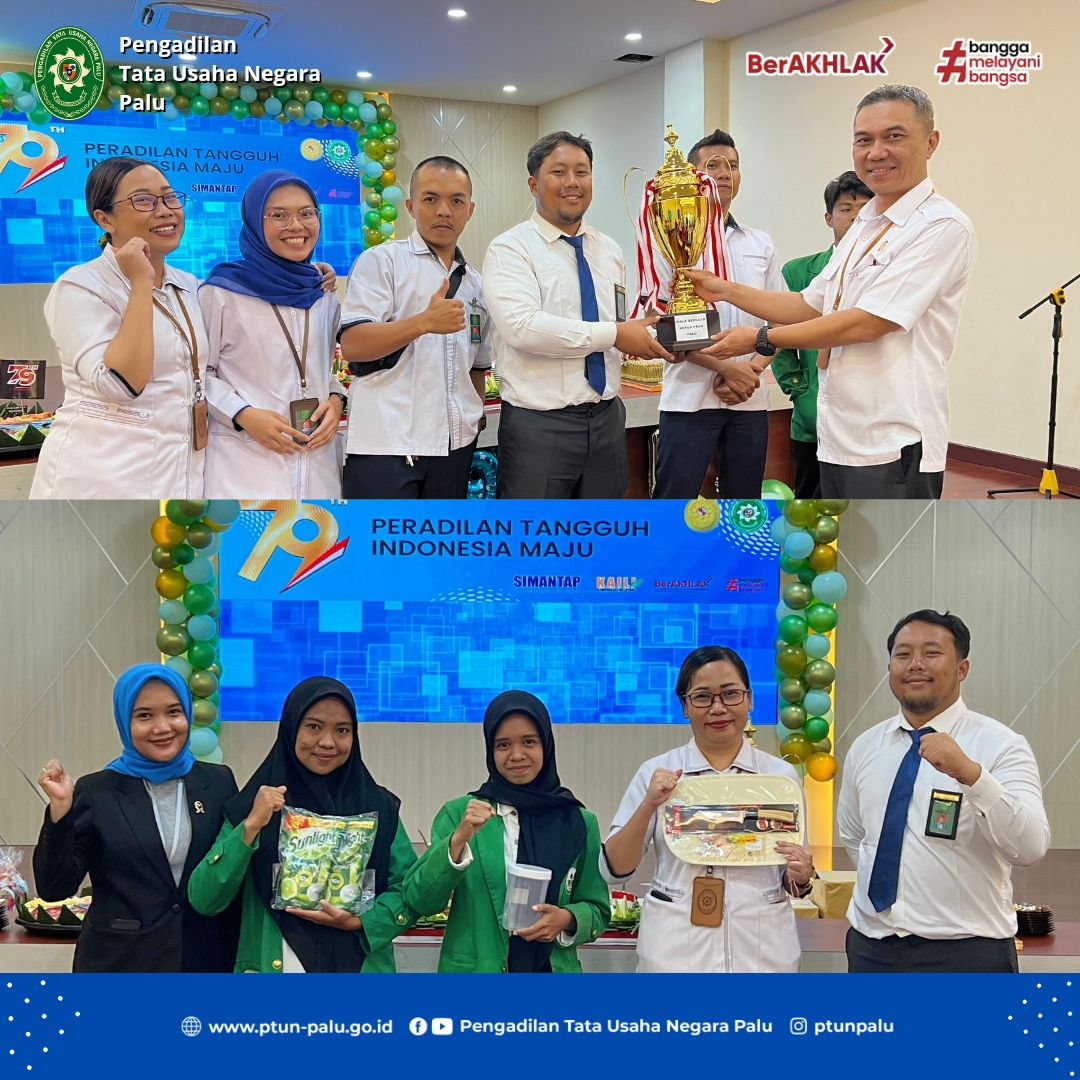 Puncak perayaan Hari Ulang Tahun Mahkamah Agung Republik Indonesia yang ke-79 dilaksanakan di aula serbaguna PTUN Palu. Acara ditandai dengan pemotongan tumpeng oleh Ketua PTUN Palu Bpk. Danan Priambada, S.H., M.H. serta penyerahan hadiah & piala bergilir kepada peserta lomba yang telah ikut berpartisipasi memeriahkan HUT Mahkamah Agung RI ke-79.