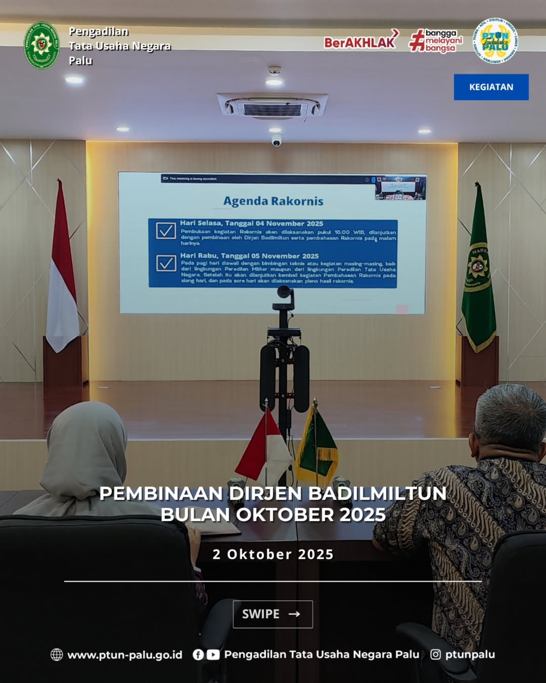 Pembinaan rutin Dirjen Badilmiltun bulan Oktober 2025 dilaksanakan secara daring yang diikuti oleh Ketua, Wakil Ketua, & Sekretaris PTUN Palu.