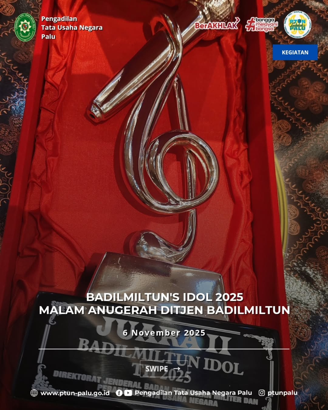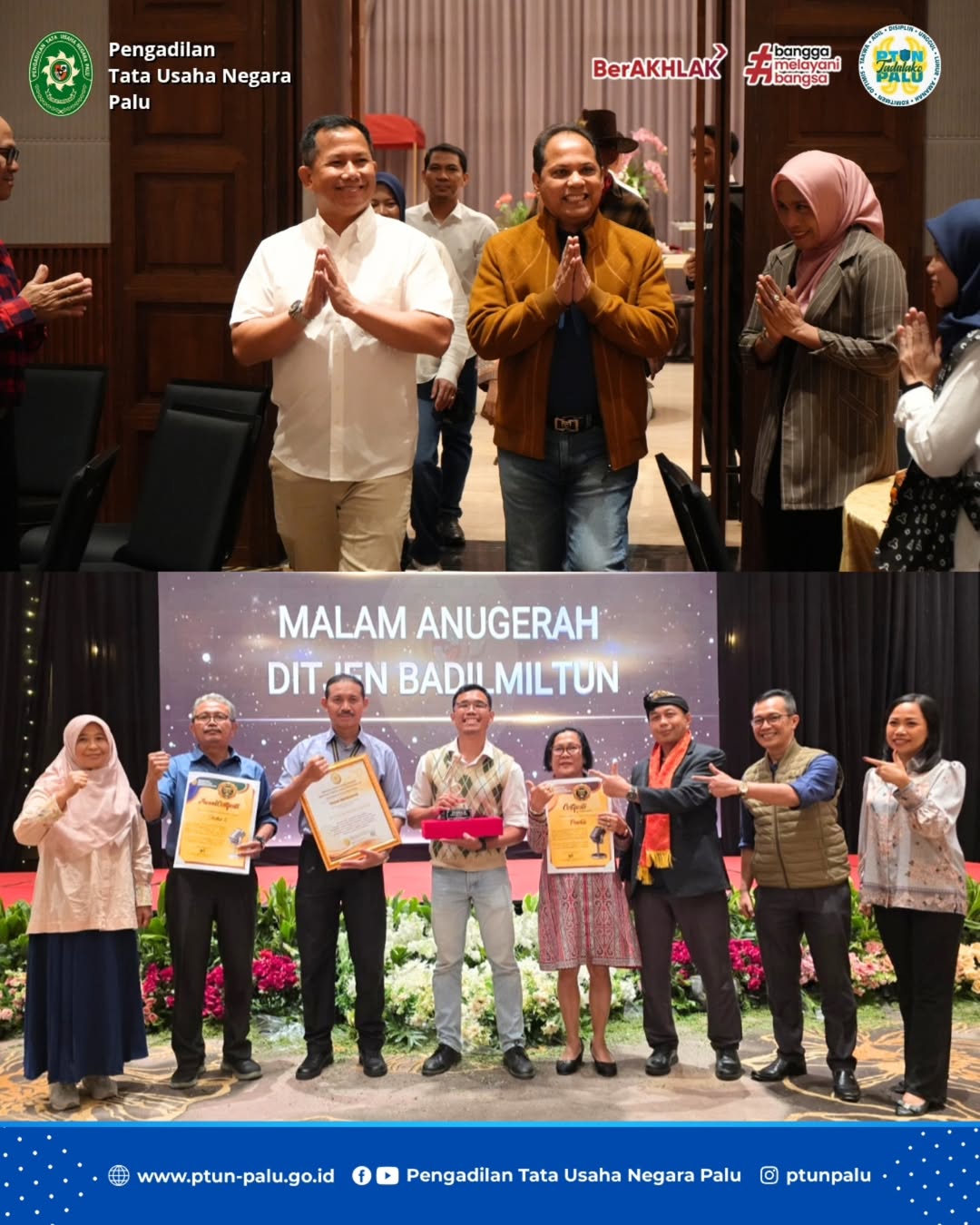 Perwakilan PTUN Palu yang mewakili PTTUN Makassar sukses meraih Juara 2 Miltun’s Idol dalam acara Penganugerahan Ditjen Badilmiltun MA RI pada kegiatan Rapat Koordinasi Teknis Peradilan Militer & TUN Tahun Anggaran 2025.