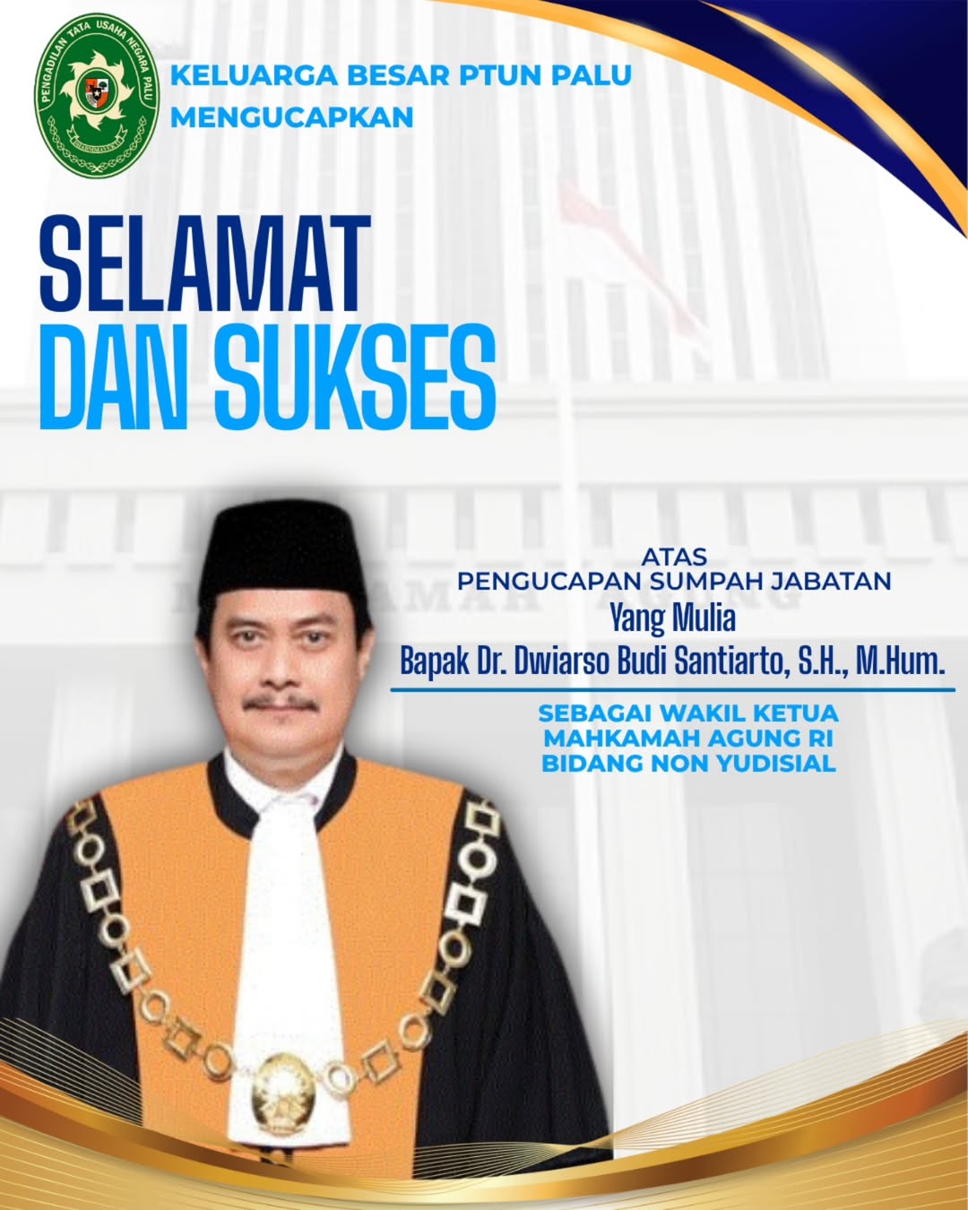 Keluarga Besar Pengadilan Tata Usaha Negara Palu mengucapkan selamat dan sukses atas pengucapan Sumpah Jabatan Yang Mulia Bapak Dr. Dwiarso Budi Santiarto, S.H., M.Hum sebagai Wakil Ketua Mahkamah Agung Republik Indonesia Bidang Non Yudisial dihadapan Presiden Republik Indonesia, Bapak H. Prabowo Subianto.