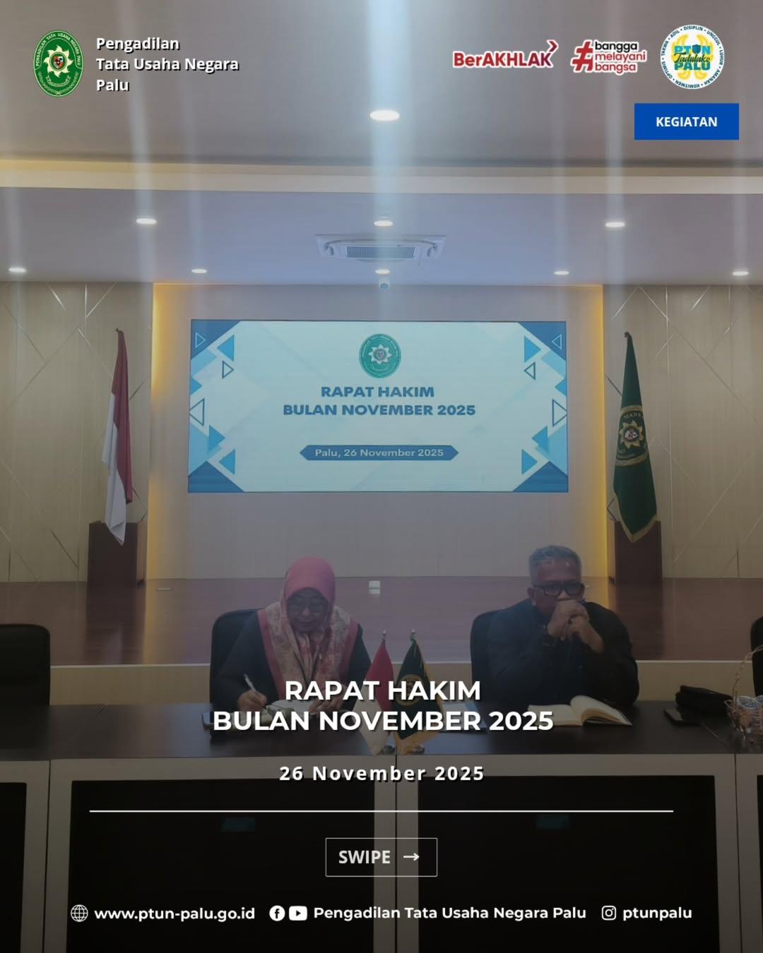 Rapat Hakim yang dipimpin oleh Ketua & didampingi Wakil Ketua PTUN Palu, di hadiri seluruh Hakim pada PTUN Palu.