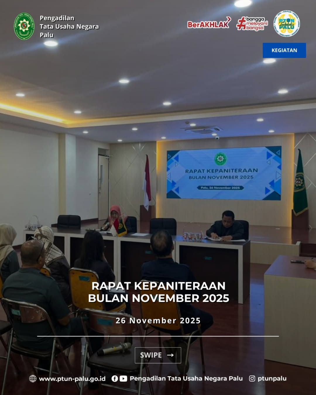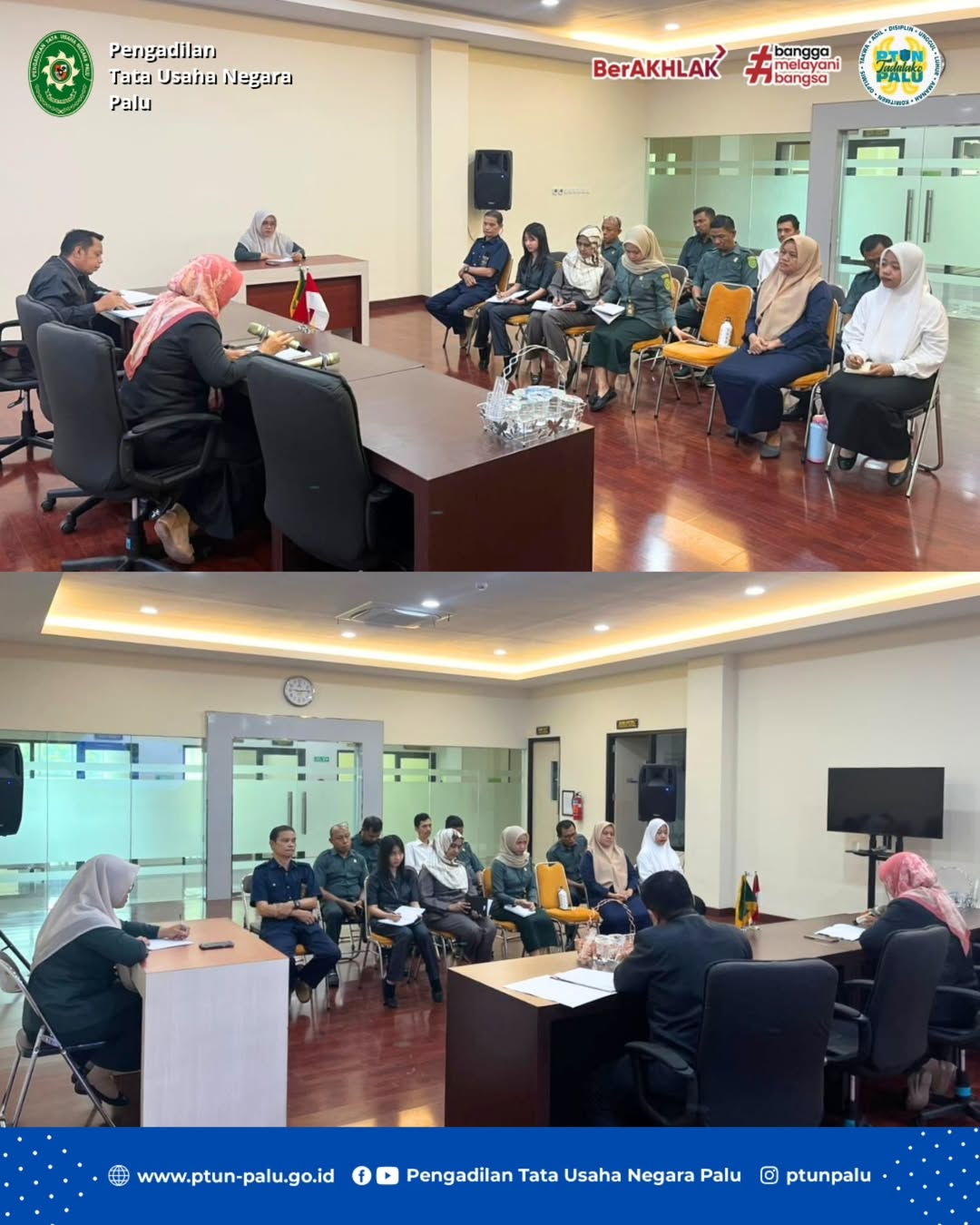 Rapat bagian Kepaniteraan yang dipimpin oleh Ketua PTUN Palu ibu Rosidah, S.H. didampingi Panitera PTUN Palu bapak Jar’an Kadir, S.H., yang dihadiri Panmud Perkara, Panmud Hukum, Panitera Pengganti, Jurusita Pengganti, serta pegawai & staf yang ada pada bagian Kepaniteraan PTUN Palu.