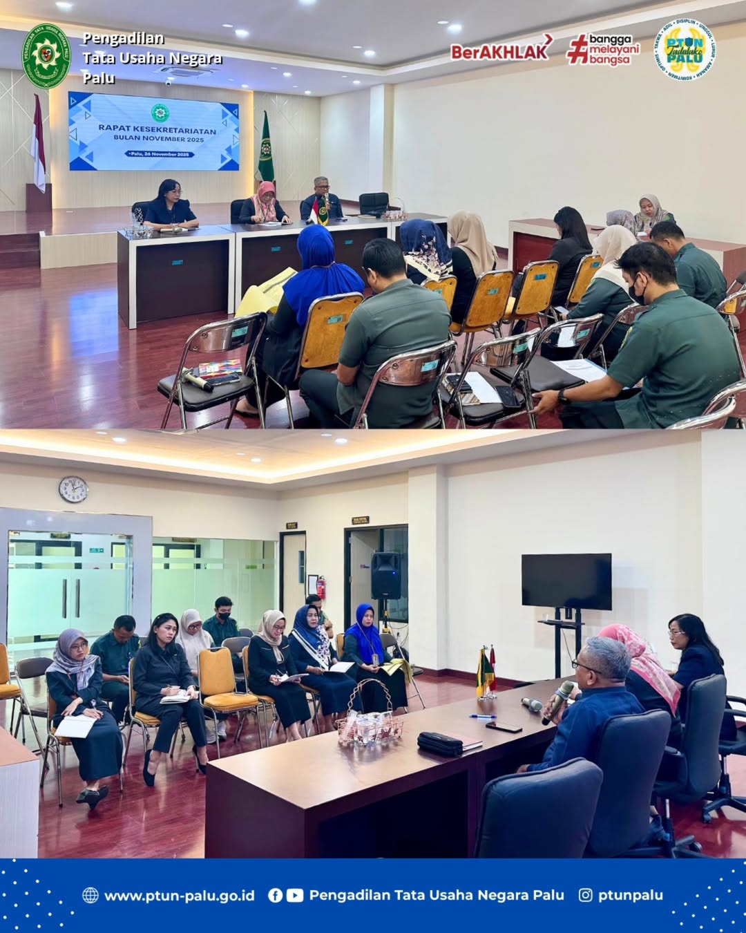 Rapat bagian Kesekretariatan yang dipimpin oleh Ketua PTUN Palu ibu Rosidah, S.H. didampingi Wakil Ketua bapak Dedy Kurniawan, S.H. dan Sekretaris ibu Imelda Christine, S.E. yang dihadiri Hakim Pengawas Bidang, Kepala Sub Bagian, serta jajaran Pegawai & Staf yang ada pada bagian Kesekretariatan PTUN Palu.