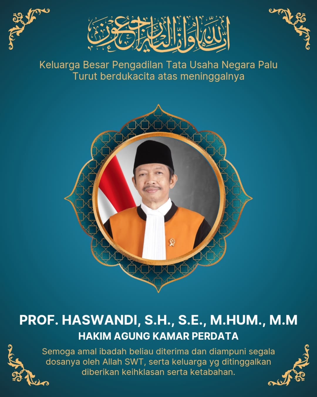 Keluarga Besar Pengadilan Tata Usaha Negara Palu turut berduka cita atas wafatnya Prof. Dr. H. Haswandi, S.H., S.E., M.Hum., M.M. Hakim Agung Kamar Perdata.