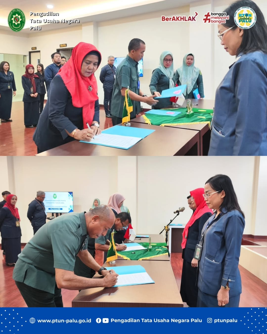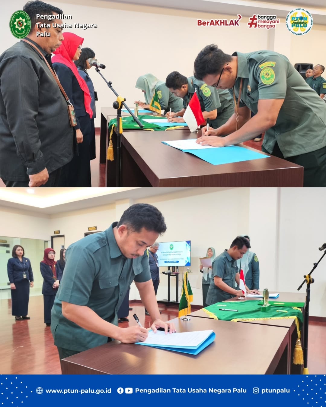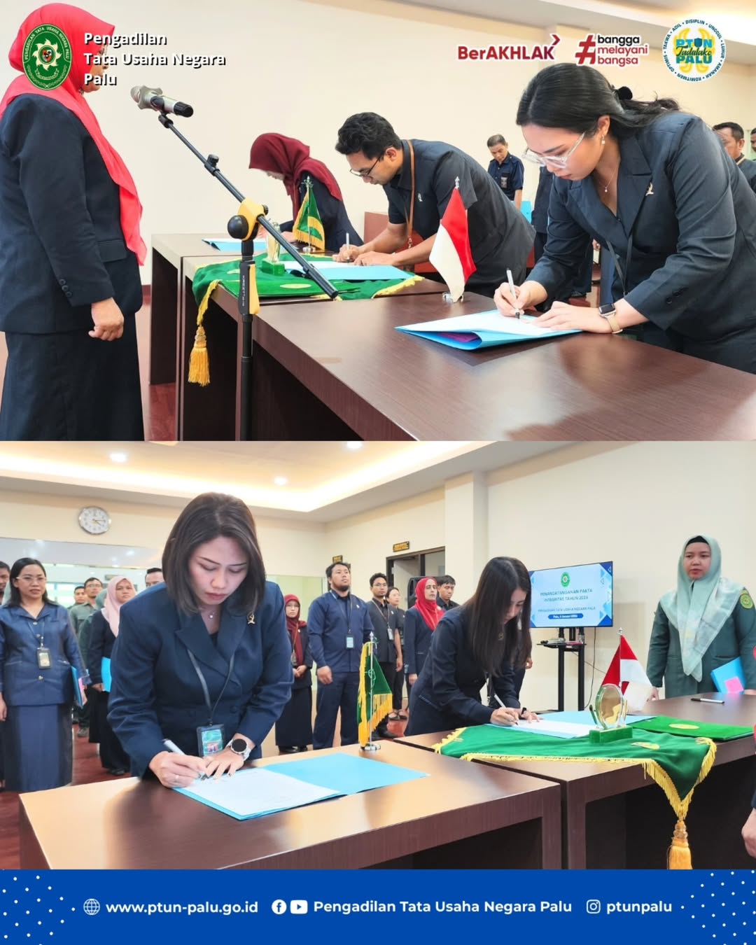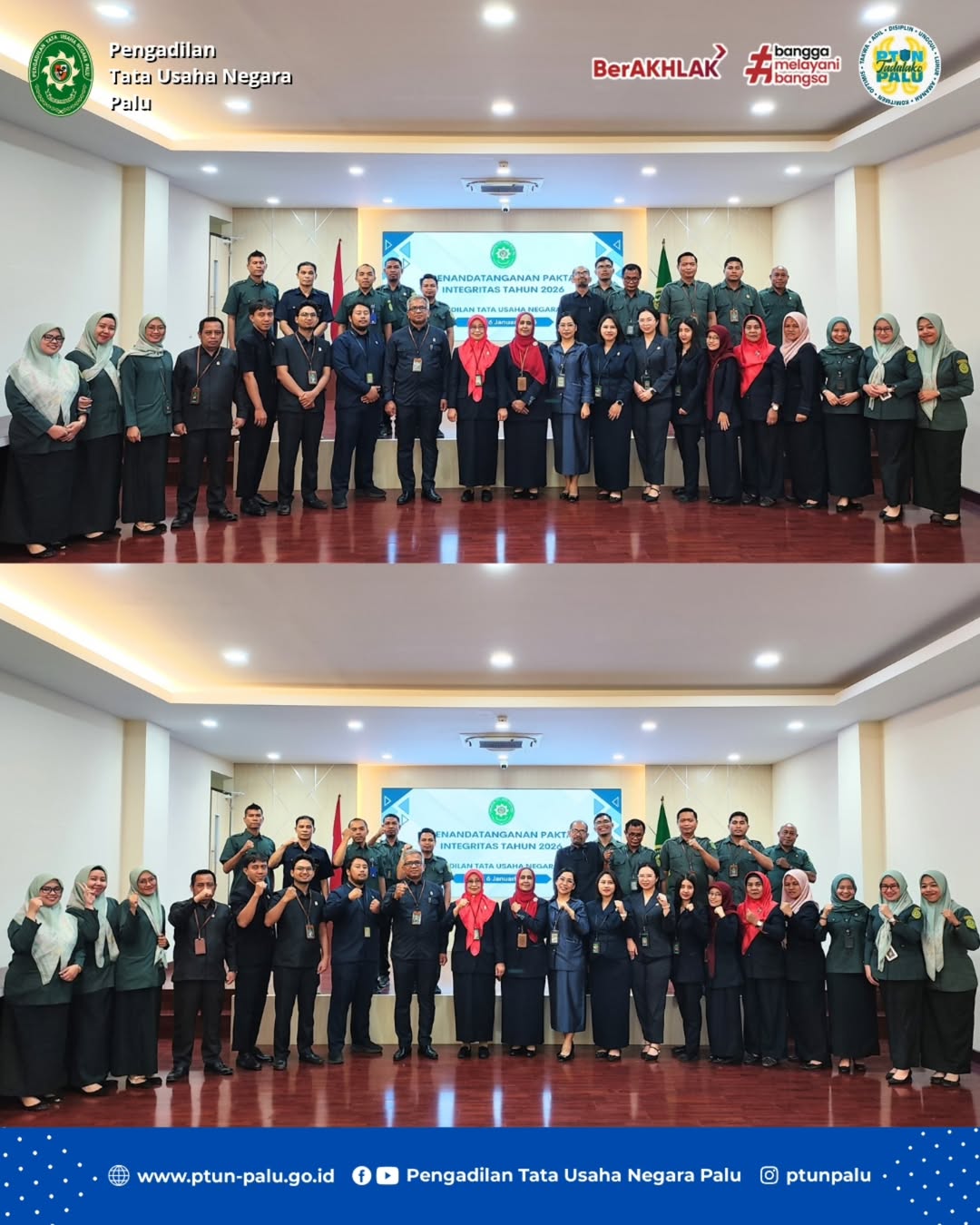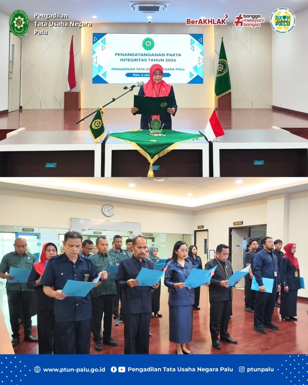 Pengadilan Tata Usaha Negara Palu menyelenggarakan kegiatan Penandatanganan Pakta Intergitas bagi Aparatur Pengadilan Tata Usaha Negara Palu berdasarkan Surat Ketua Pengadilan Tata Usaha Negara Palu Nomor 50/KPTUN.W4-TUN2/UND.OT1/I/2026 tanggal 5 Januari 2026 hal: Undangan Penandatanganan Pakta Integritas 2026, yang diselenggarakan di Ruang Serba Guna Pengadilan Tata Usaha Negara Palu.