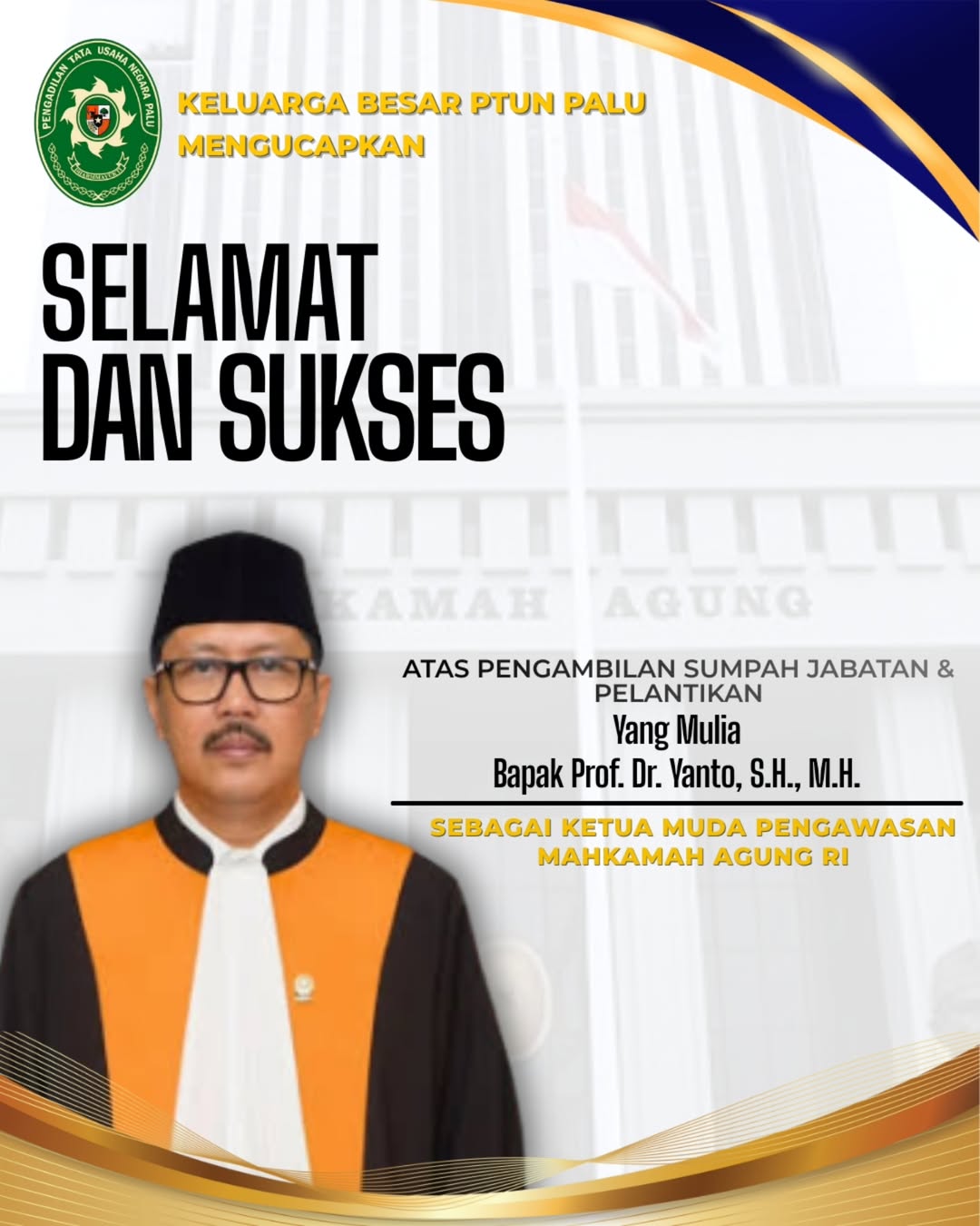 Keluarga Besar Pengadilan Tata Usaha Negara Palu mengucapkan selamat dan sukses atas Pengucapan Sumpah Jabatan & Pelantikan Yang Mulia Bapak Prof. Dr. Yanto S.H., M.H. sebagai Ketua Muda Pengawasan Mahkamah Agung Republik Indonesia.
