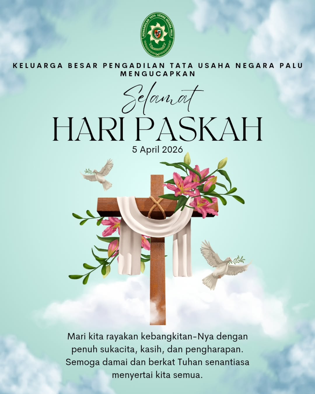 Keluarga Besar Pengadilan Tata Usaha Negara Palu mengucapkan Selamat Merayakan Hari Paskah, 5 April 2026.