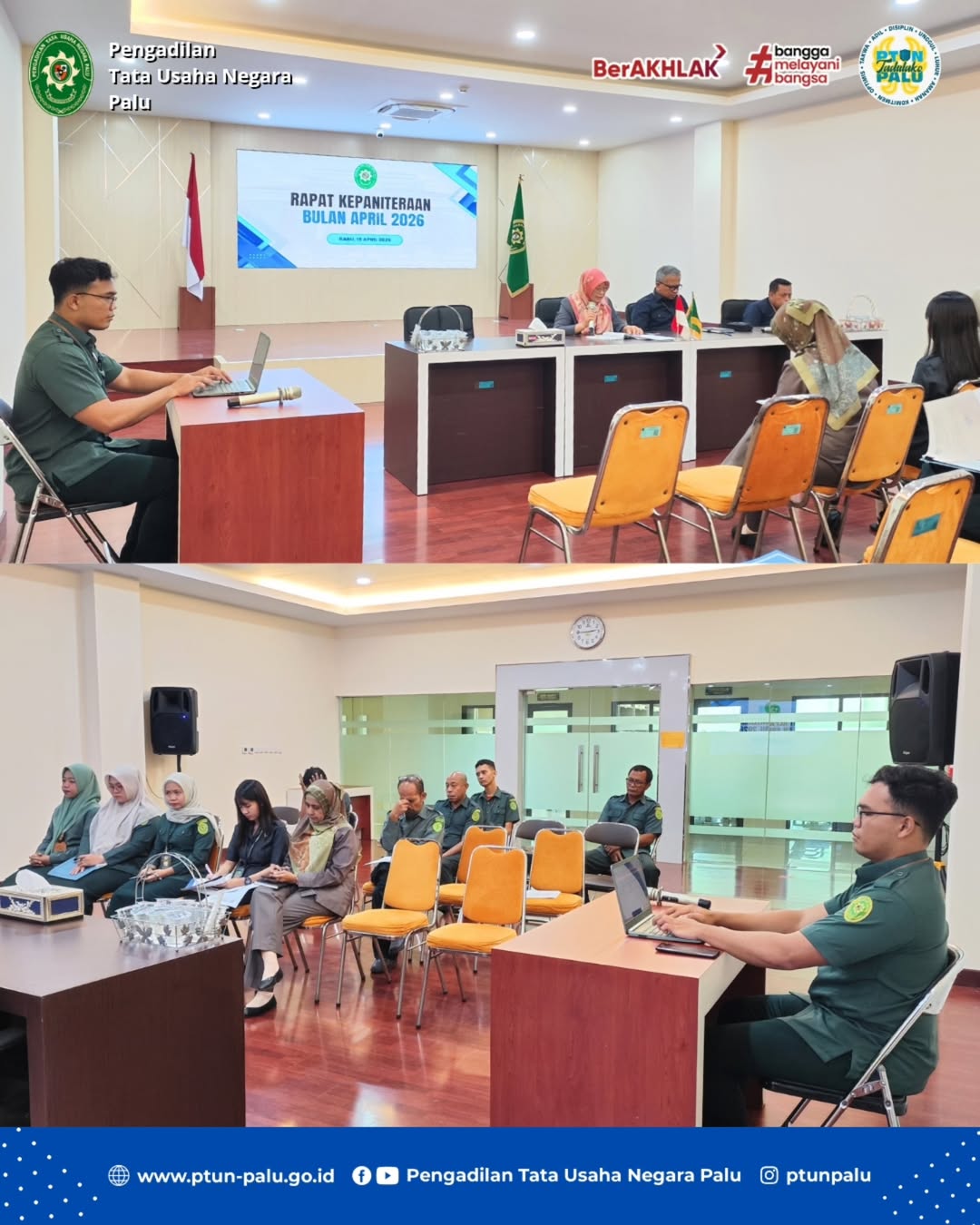 Rapat bagian Kepaniteraan yang dipimpin oleh Ketua PTUN Palu ibu Rosidah, S.H. didampingi Wakil Ketua bapak Dedy Kurniawan, S.H. & Panitera PTUN Palu bapak Jar’an Kadir, S.H., yang dihadiri Panmud Perkara, Panmud Hukum, Panitera Pengganti, Jurusita Pengganti, serta pegawai & staf yang ada pada bagian Kepaniteraan PTUN Palu.