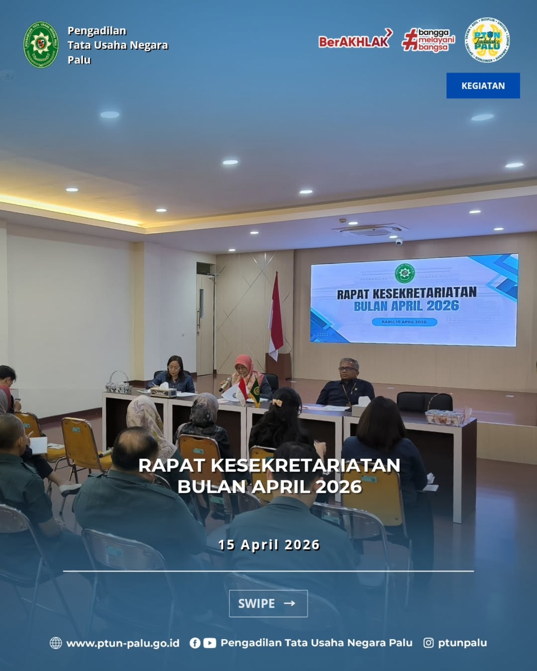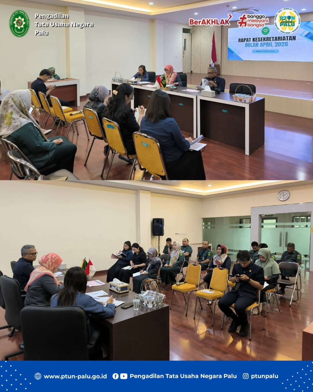 Rapat bagian Kesekretariatan yang dipimpin oleh Ketua PTUN Palu ibu Rosidah, S.H. didampingi Wakil Ketua bapak Dedy Kurniawan, S.H. dan Sekretaris ibu Imelda Christine, S.E. yang dihadiri Hakim Pengawas Bidang, Kepala Sub Bagian, serta jajaran Pegawai & Staf yang ada pada bagian Kesekretariatan PTUN Palu.