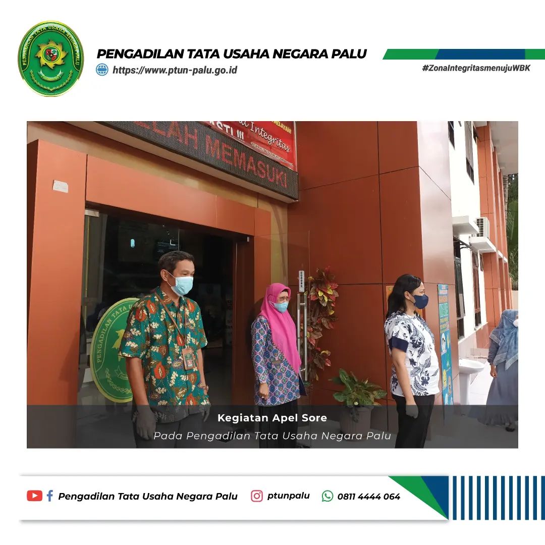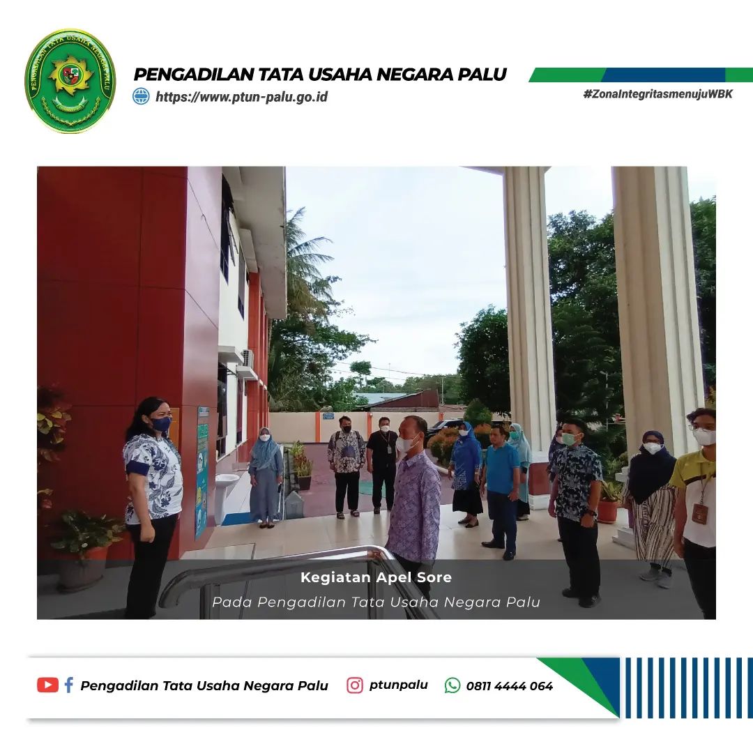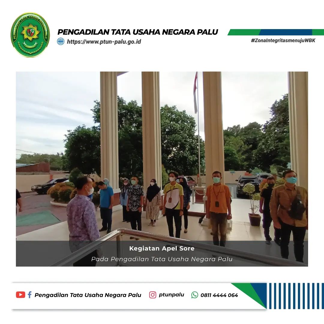 Bertempat di halaman kantor Pengadilan Tata Usaha Negara Palu, seluruh warga PTUN Palu mengikuti kegiatan Apel Sore pada pukul 17.00 WITA dengan tetap menerapkan protokol kesehatan.