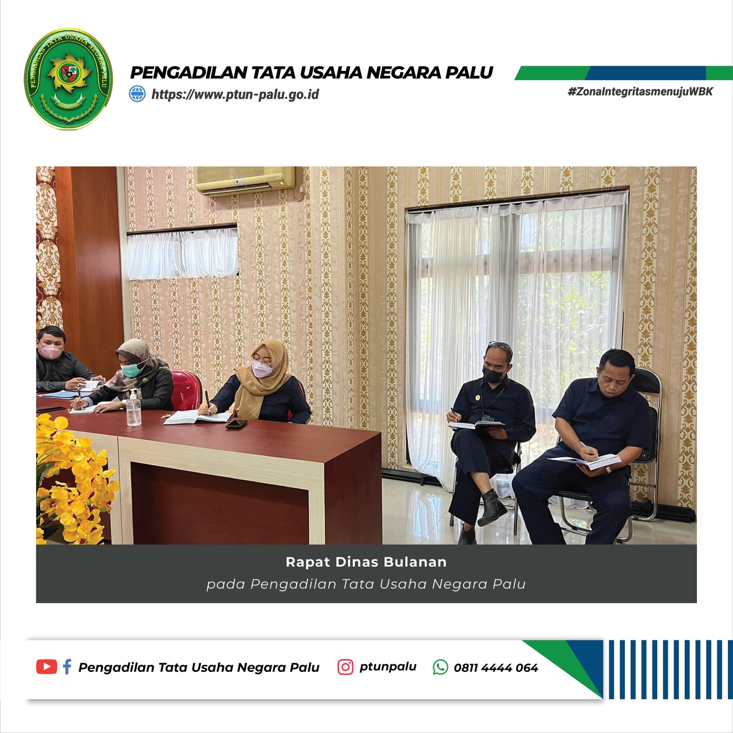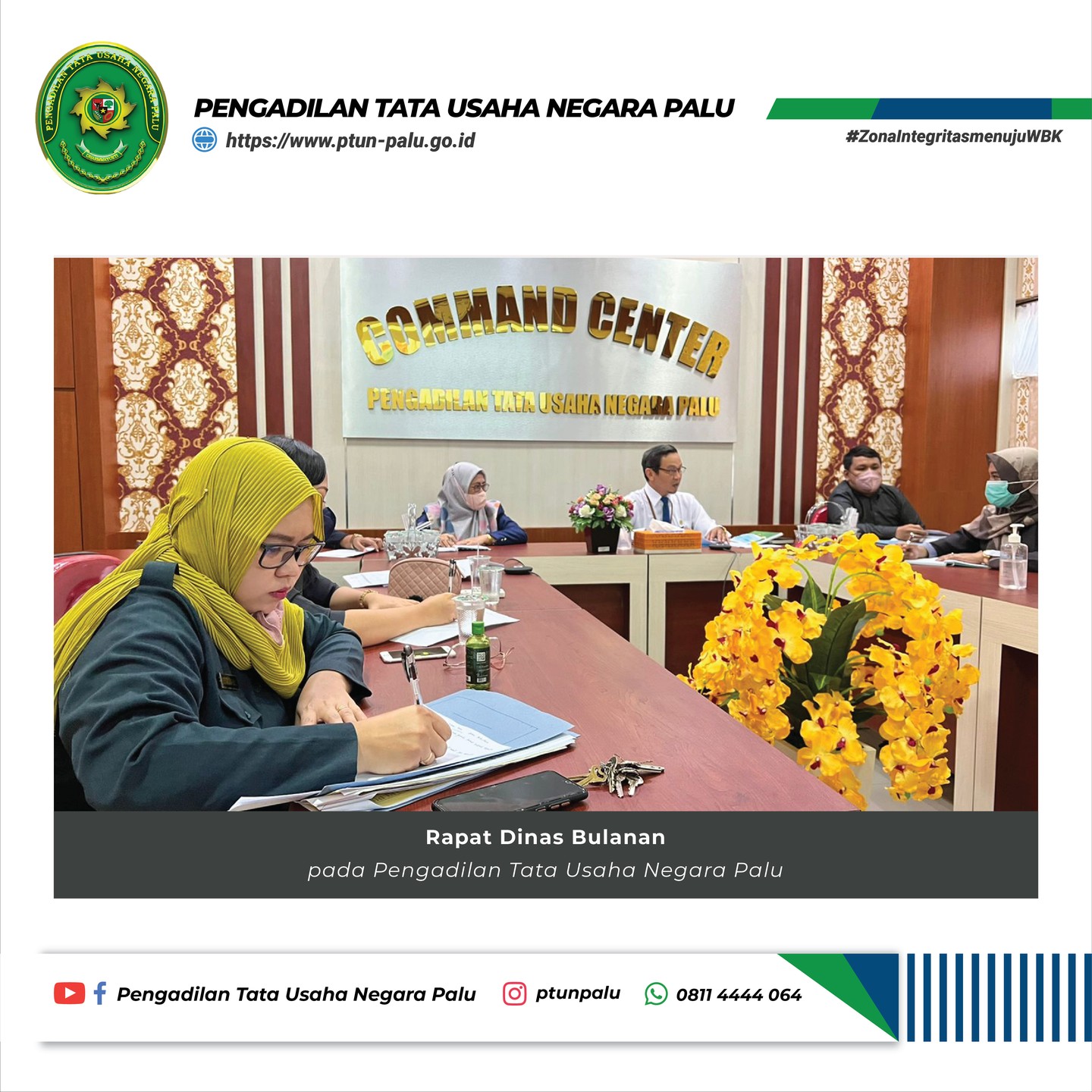 Bertempat di ruang Command Center Pengadilan Tata Usaha Negara Palu, Wakil Ketua, Hakim, Panitera, Sekretaris, Para Pejabat Struktural dan Panmud Hukum mengikuti rapat secara offline, kemudian para pejabat fungsional, pejabat pelaksana dan PPNPN PTUN Palu mengikuti rapat secara online melalui aplikasi zoom meeting dengan tetap menerapkan protokol kesehatan.