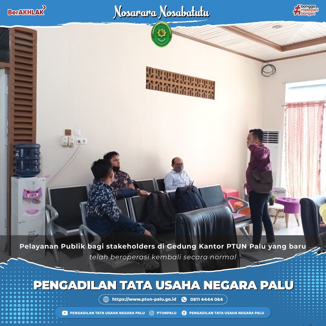 Rabu, 25 Mei 2022, Pelayanan publik bagi stakholders di Gedung Kantor PTUN Palu yang baru (Jl. Pue Bongo, WIsma Alam Raya No. 78, Palu Barat) telah beroperasi kembali secara normal.