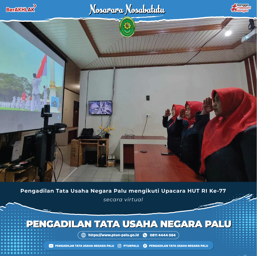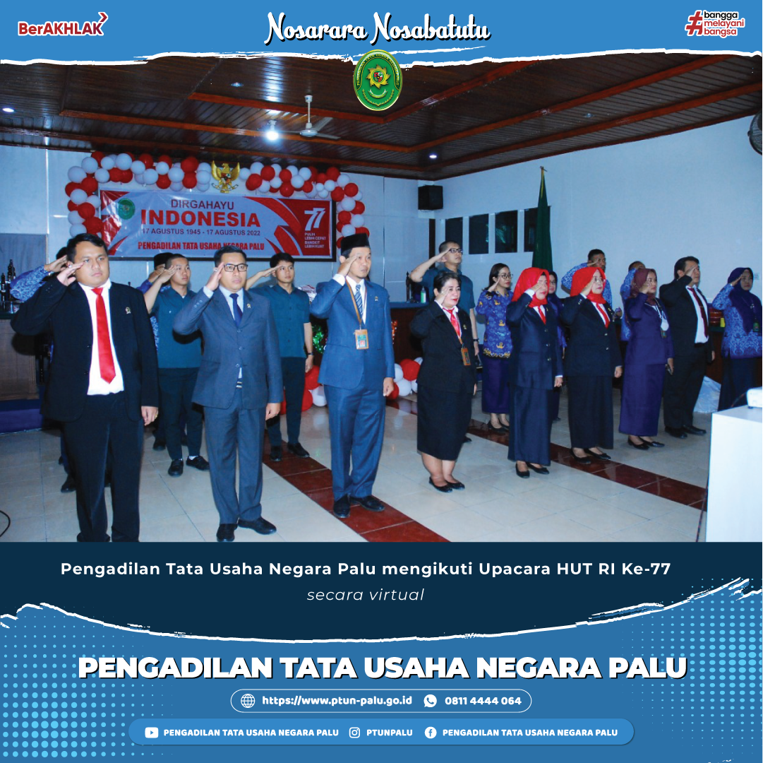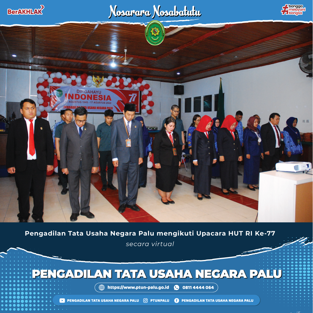 Pengadilan Tata Usaha Negara Palu (PTUN Palu) mengikuti Upacara Pengibaran Bendera HUT RI Ke-77 secara virtual pada hari Rabu, 17 Agustus 2022 pukul 10.30 WITA s.d. selesai dan Upacara Penurunan Bendera pada pukul 18.00 WITA s.d. selesai yang diikuti oleh Ketua, Wakil Ketua, para Hakim, Pegawai dan PPNPN PTUN Palu.