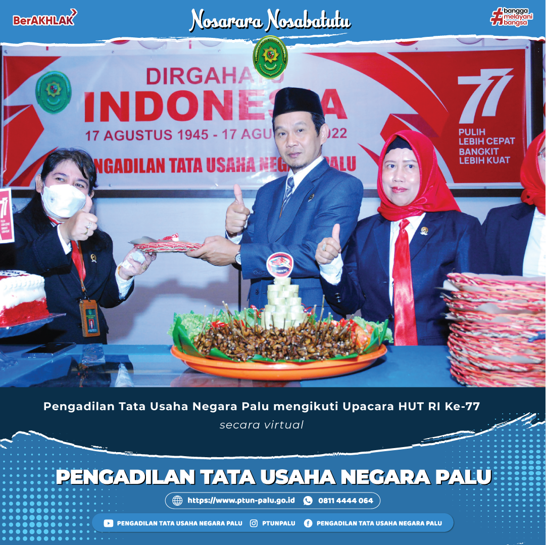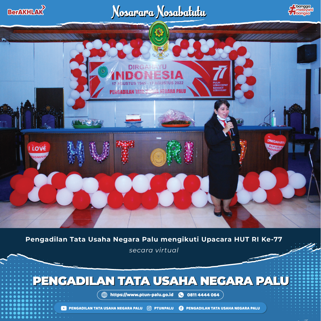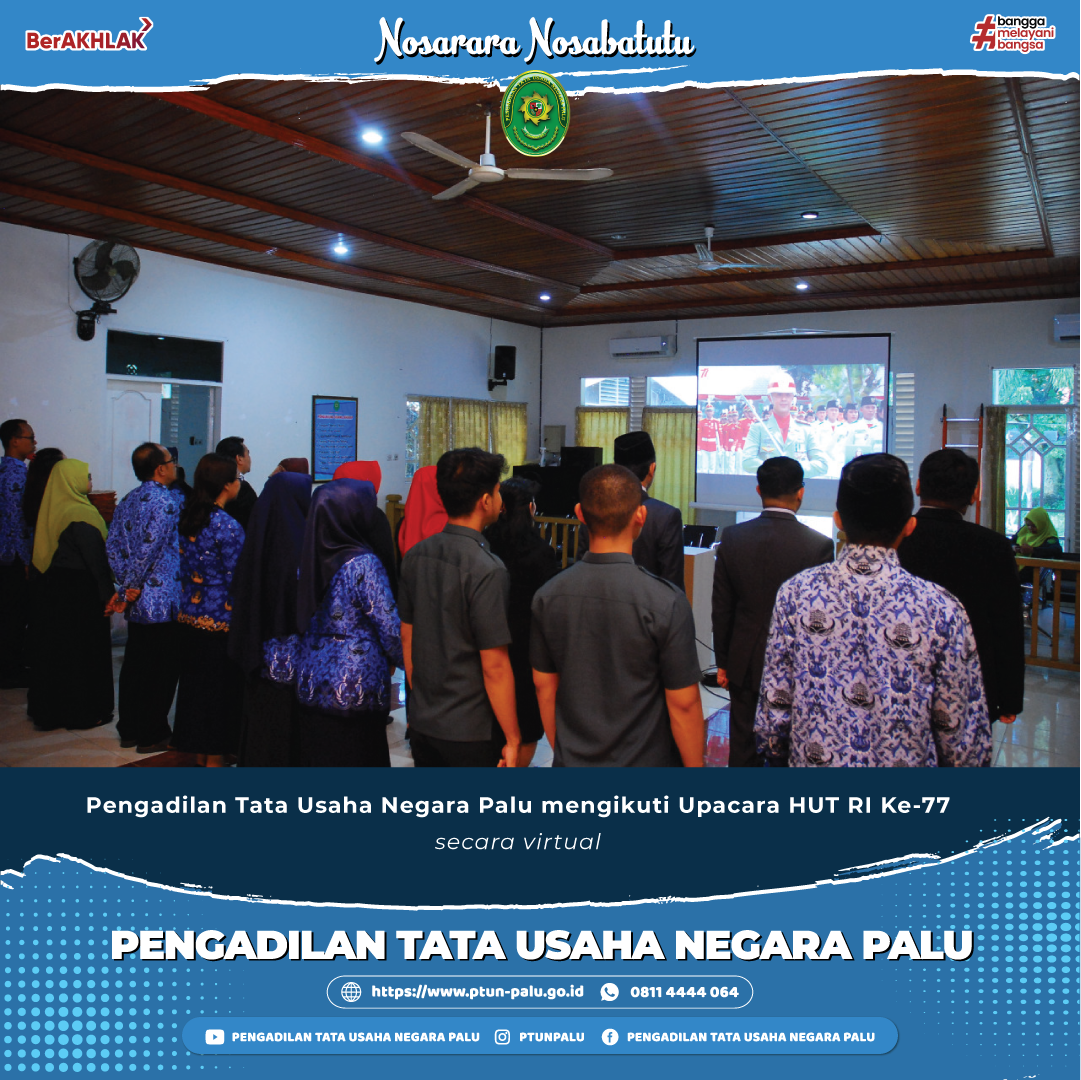 Pengadilan Tata Usaha Negara Palu (PTUN Palu) mengikuti Upacara Pengibaran Bendera HUT RI Ke-77 secara virtual pada hari Rabu, 17 Agustus 2022 pukul 10.30 WITA s.d. selesai dan Upacara Penurunan Bendera pada pukul 18.00 WITA s.d. selesai yang diikuti oleh Ketua, Wakil Ketua, para Hakim, Pegawai dan PPNPN PTUN Palu.